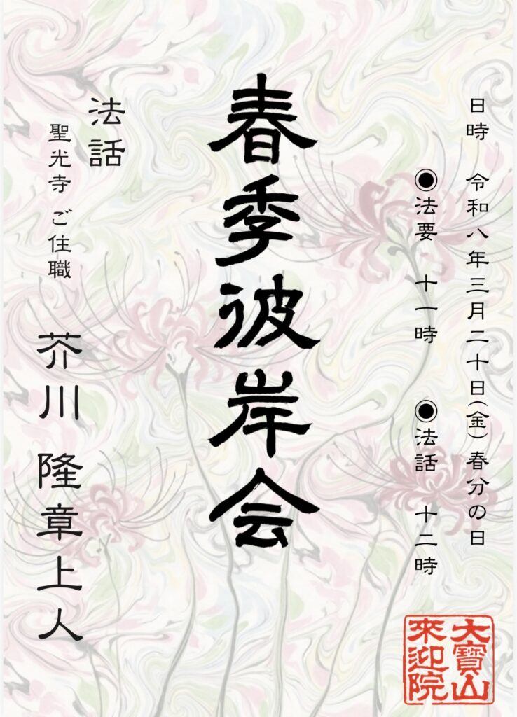 【春季彼岸会2026】のお知らせ🌸 2026.03.15 お知らせ 【春季彼岸会2026】のお知らせ🌸 春のお彼岸は「春分の日」を中日とした前後3日間、 計7日間です。 当山では毎年、中日にあたる春分の日に 「春季彼岸法要」を厳修いたします。 ■ 日時:3月20日(金・祝) ・11:00〜 法要 ・12:00〜 法話(聖光寺 ご住職 芥川 隆章 上人) ※お接待:お弁当を準備しております。 どなたさまもお気軽にお参りください。 皆さまのご参詣を心よりお待ちしております🙏 合掌