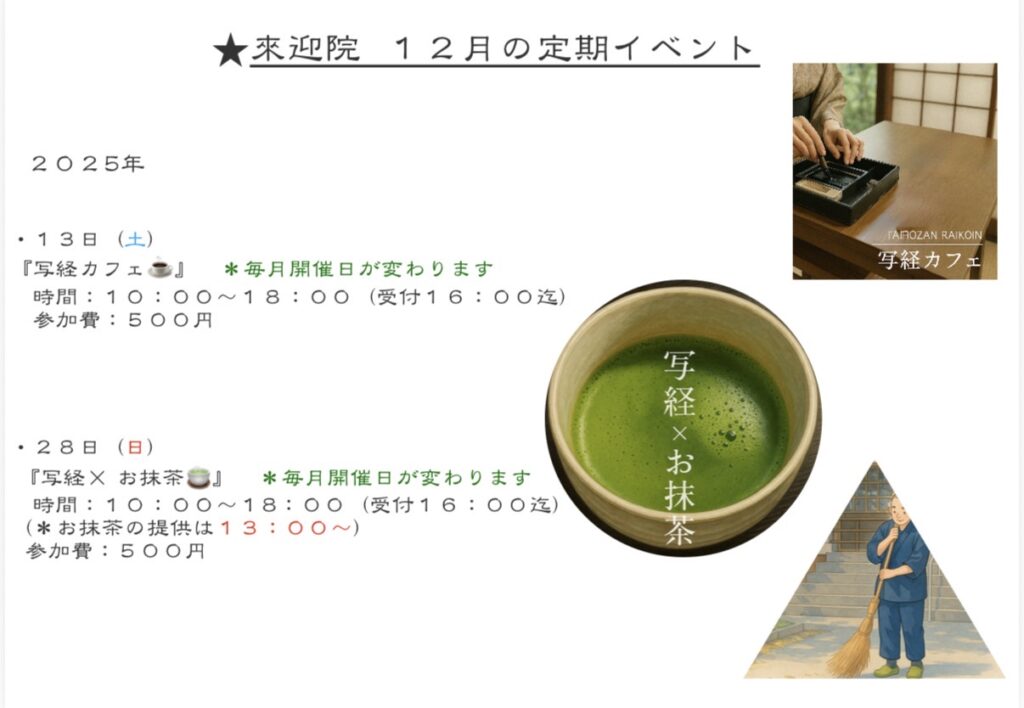 2025年 12月 【定期イベントご案内】 ⭕️13日(土) 『写経カフェ』 時間 10:00~18:00(受付17:00迄) 参加費:500円 ======…